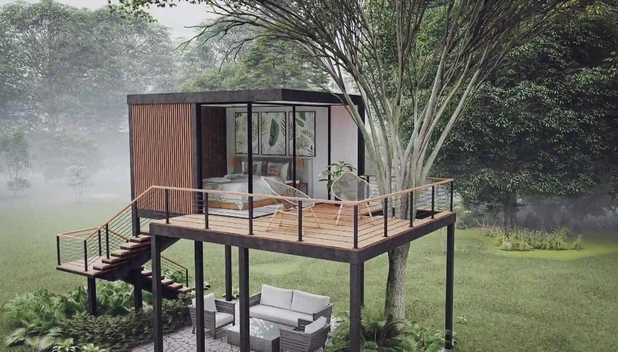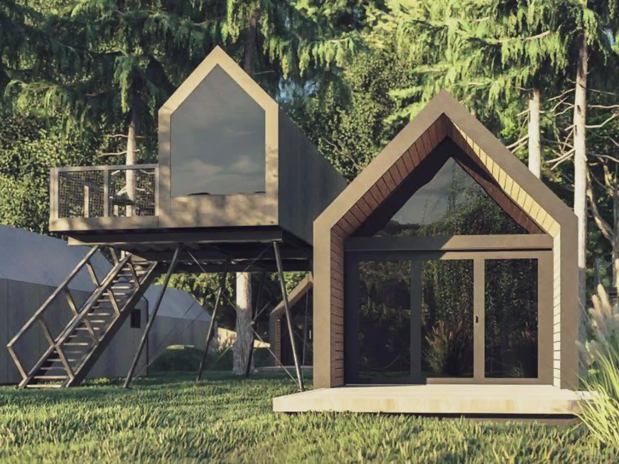 The "California" model is a stylish and modern home designed to seamlessly blend with the natural landscape. This thoughtfully crafted design combines aesthetic appeal with exceptional functionality, offering a cozy and inviting space for relaxation and living.