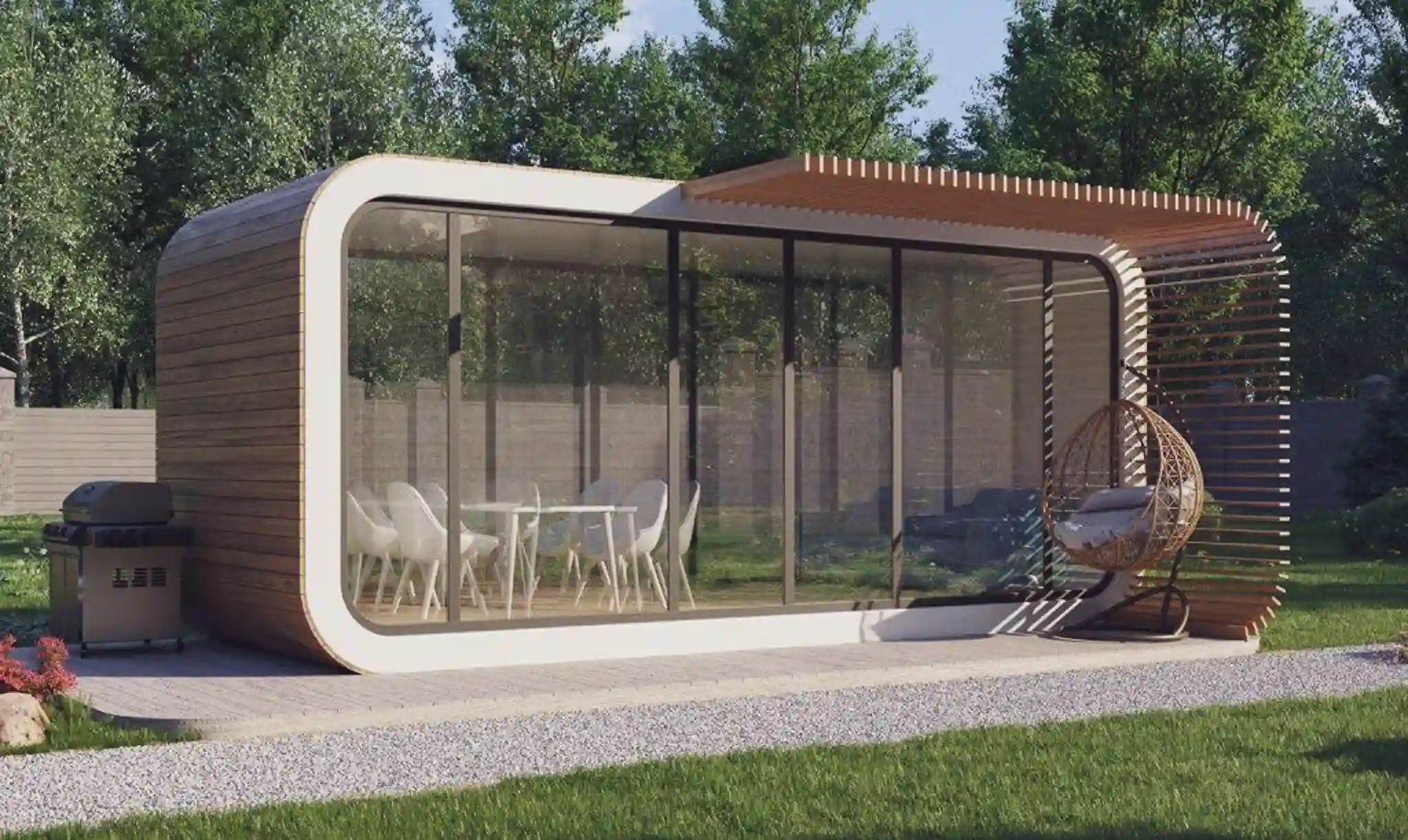 The exterior wood finish adds warmth and charm, making the "California" model an ideal choice for those who appreciate comfort and style in every aspect of their living space.